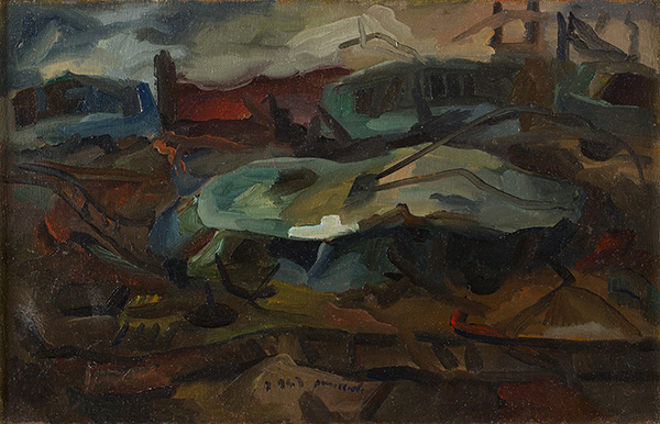 GIOVANNI OMICCIOLI , Bombardamento a Roma, 1943, Olio su tela, 24 x 38 cm, Firma e data in basso al centro: 7 - 943 Omiccioli Titolo, data e firma al retro sul telaio: Bombardamento a Roma Omiccioli 1943 Inscritto in basso al retro sul telaio: mostra dell’arte contro la barbarie, Galleria di Roma 1944 Etichetta al retro della mostra in Unione Sovietica, 1968 - 1972, al Museo di Belle Arti di PuŝKin ESPOSIZIONI Galleria di Roma, L’Arte contro la barbarie, 23 agosto - 5 settembre 1944, Roma 1944 Museo di Belle Arti di PuŝKin, mostra itinerante 1968 - 72, Unione Sovietica