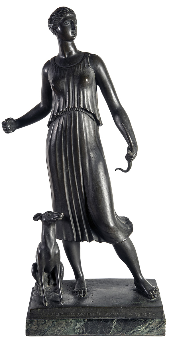 AMLETO CATALDI, Cacciatrice con cane, Gruppo in bronzo, h. 58 cm circa (con la base in marmo, h. 61 cm), Firma e iscrizione in basso: su disegno dell’Architetto Brasini - A. Cataldi