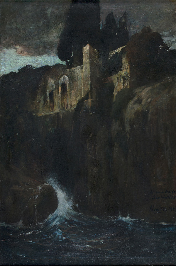 OSCAR MENDLIK, Rovine sul mare, 1901, Olio su tela, 114,5 x 75 cm, Firma, dedica e data in basso a destra: Al mio Amico ..., Mendlik, 1901