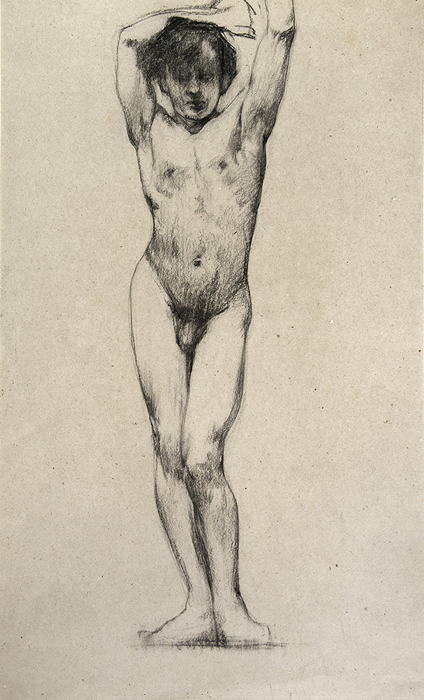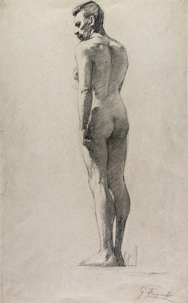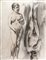 GIOVANNI ZANGRANDO, Tre disegni: studi di nudi, Carboncino su carta, 57 x 34 cm circa, 58,5 x 36 cm, 54,5 x 42 cm circa (rispettivamente), Firma al retro: Zangrando (il primo e il terzo)Firma in basso a destra: G. Zangrando (il secondo) Timbro al retro de Il Giardino Antiquariato - Mostra di disegni di Trieste (il primo e il terzo)
