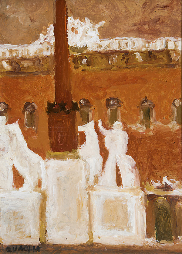 CARLO QUAGLIA, I Dioscuri al Quirinale, Anni ‘60, Olio su faesite, 35 x 25 cm, Firma in basso a sinistra: QUAGLIA Etichetta al retro della INTERART - Roma Autentica con foto della Galleria d’Arte Rosemberg, Milano, 28 febbraio 2005 ESPOSIZIONI E PUBBLICAZIONI I Maestri della Scuola Romana, a cura di A. Statuti, Florence Number Nine, Firenze 2014, p. 19