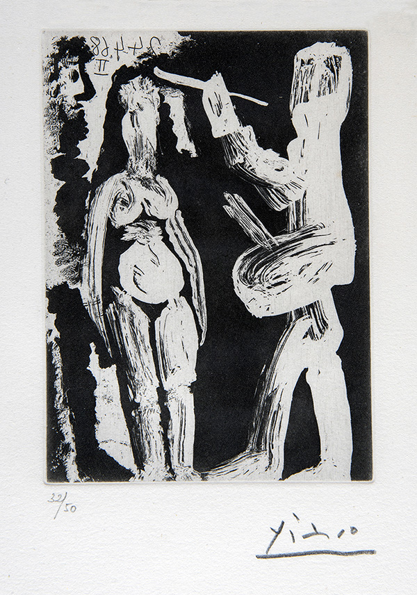 PABLO PICASSO, Atelier dell’artista, 1968, Acquatinta, n. esemplare 32/50, 12 x 8,7 cm (la lastra); 31,5 x 24,5 cm circa, Firma in basso a destra: Picasso Numero d’esemplare in basso a sinistra Data in alto a sinistra: 24.4.68 II Etichette al retro della Galleria Il Segno di Roma e della Galleria Landi