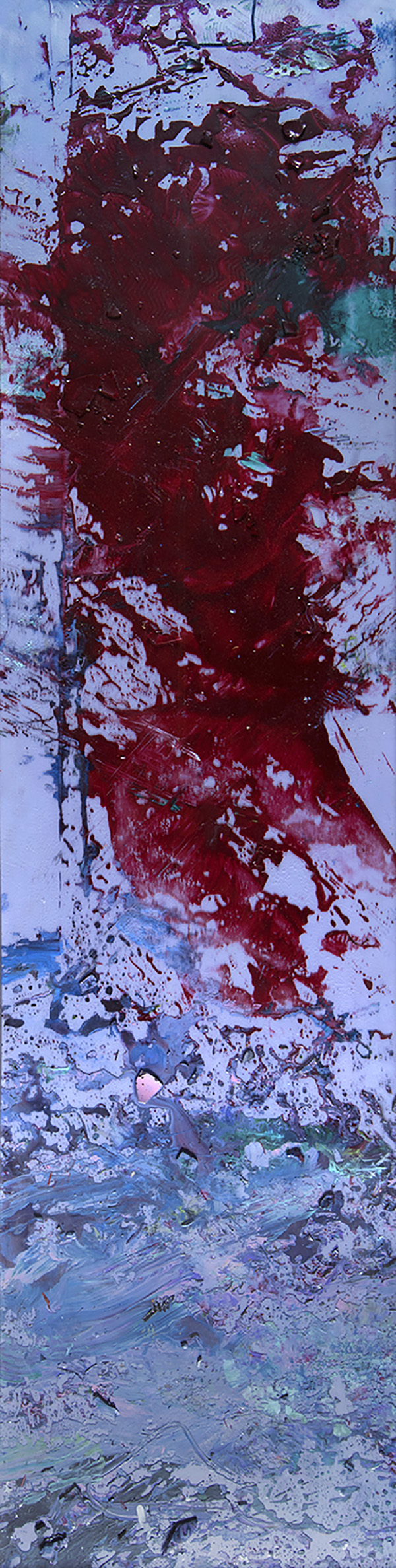 SHŌZŌ SHIMAMOTO, MAGIB45, 2008, Bottle crash: colori acrilici e cocci di vetro su ritaglio di polietilene, 180 x 40 cm, Etichetta al retro del MAGI Museo d’Arte Performance 'I colori della Pace', 11 novembre 2008, Museo MAGI900 L’opera è corredata di dvd video della performance