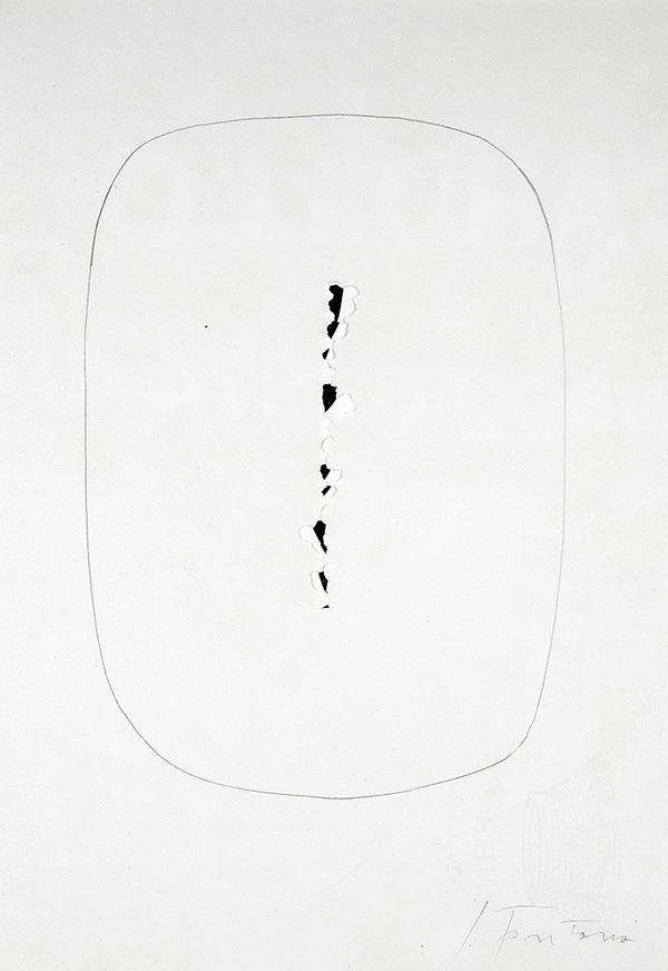 LUCIO FONTANA, Concetto spaziale, ante 1965, Matita su carta (Fabriano) con fori realizzati dall’Artista, 35,5 x 25,5 cm circa, Firma in basso a destra: Fontana 150 copie firmate e numerate, nel volume Apocalissi e sedici traduzioni di Giuseppe Ungaretti, ed. Bucciarelli, Ancona 1965 PUBBLICAZIONI H. Ruhé - C. Rigo, Lucio Fontana, graphics, multiples and more, Tuja Books, p. 16 Autentica su foto dell’Archivio Lucio Fontana, Milano 19 settembre 1974