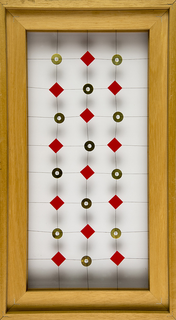 MANFREDO MASSIRONI, Rondelle e rombi, 1961, Fili di ferro, rondelle d’ottone e legno, 42,3 x 24,2 cm, Firma all’interno sulla sinistra: Massironi Autentica su foto dell’Artista