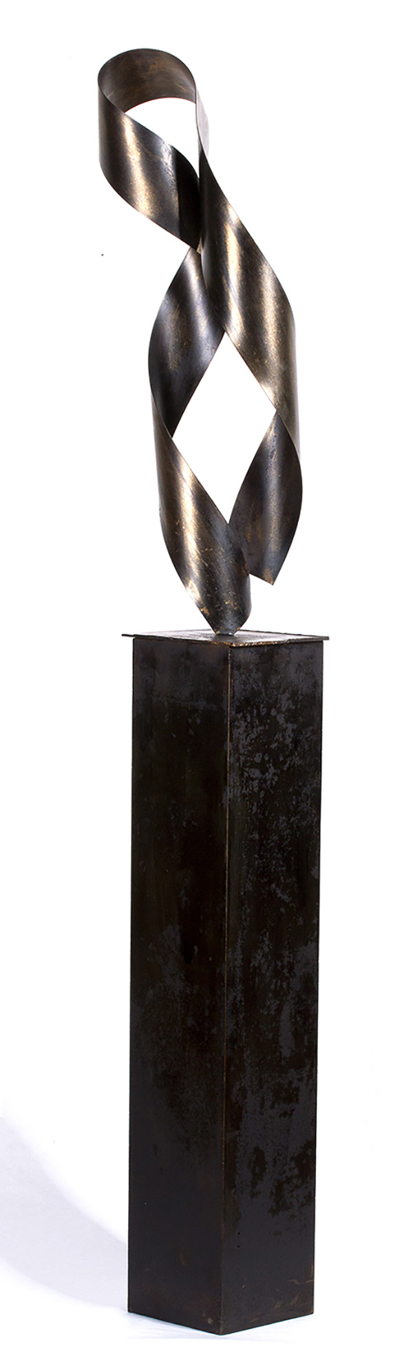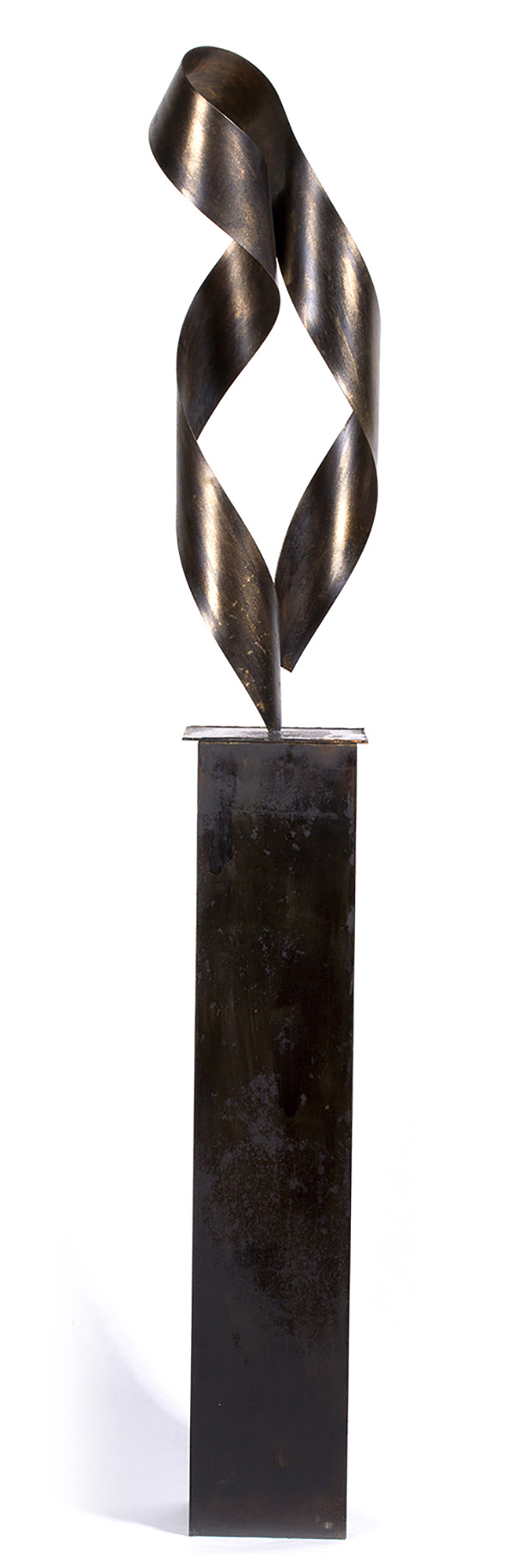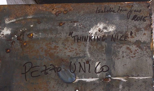 ISABELLA NURIGIANI, Thinking nice, 2016, Scultura in ferro, 188 x 23,4 x 20,5 cm (senza la base, h. 85 cm), Firma, data, titolo e iscrizione sotto la base: Isabella Nurigiani 2016, “Thinking nice”, Pezzo unico