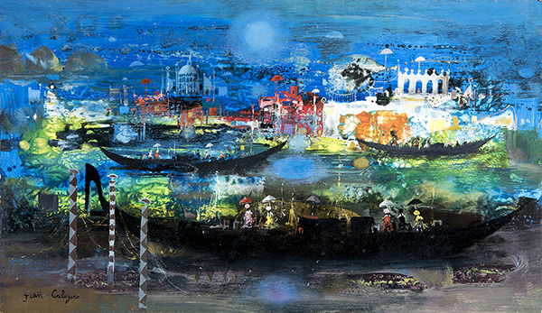JEAN CALOGERO, Fête à Venise, 1980, Olio su tavoletta, 29,5 x 49,5 cm, Firma in basso a sinistra: Jean Calogero Timbro al retro dell’Archivio Jean Calogero di Catania