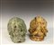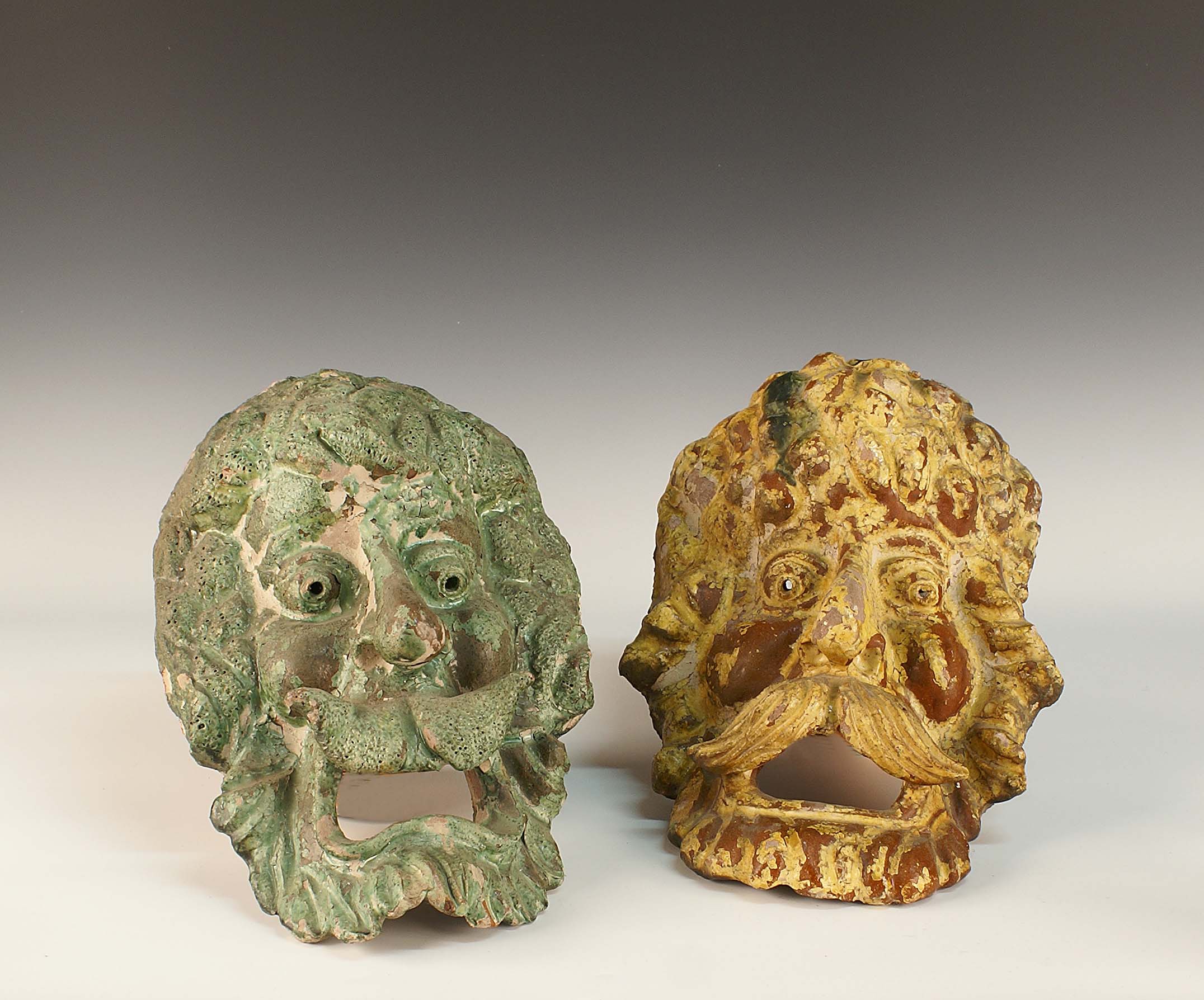Coppia di mascheroni in terracotta smaltata dipinta in ploicromia a...