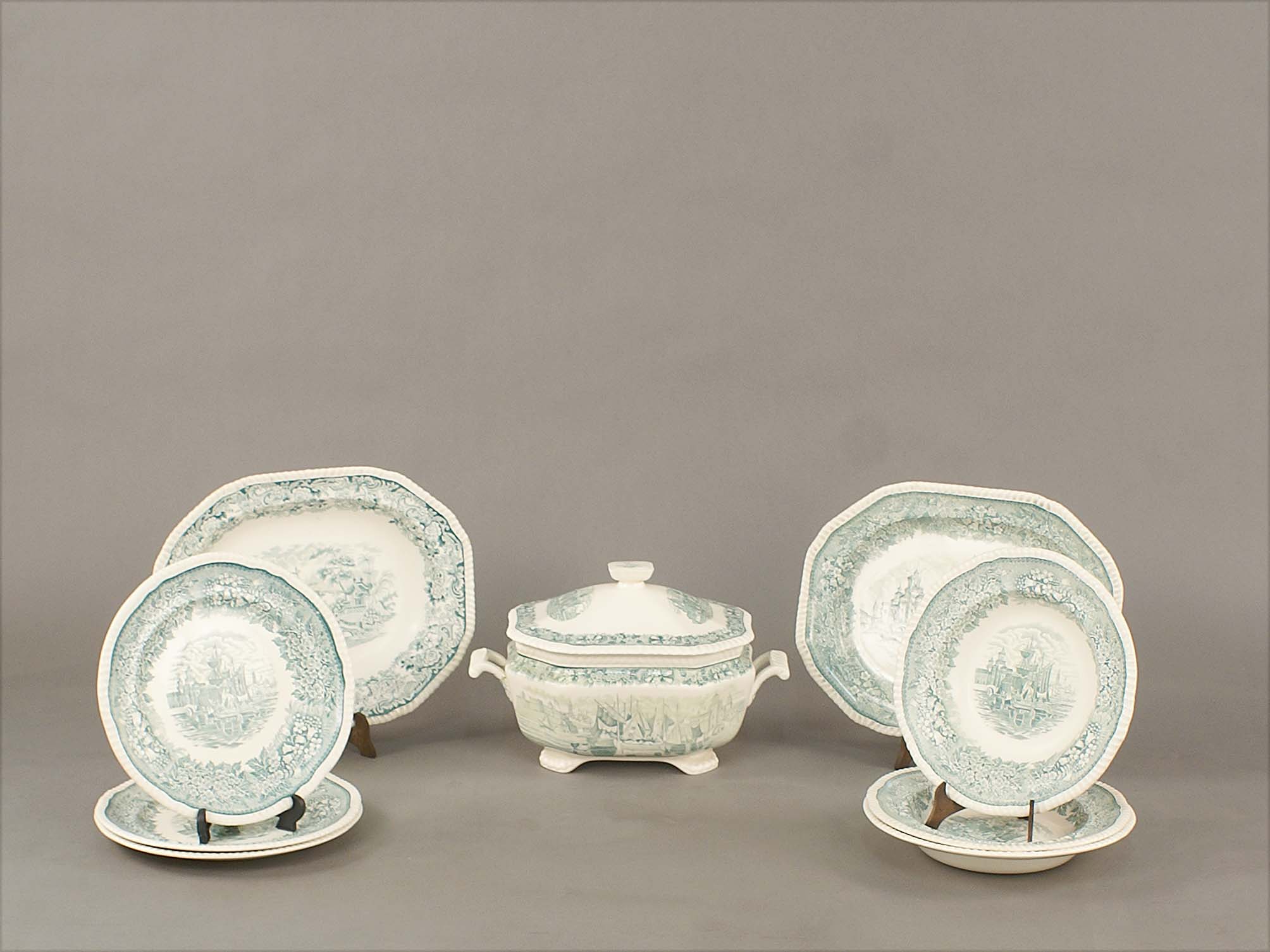 Servizio in ceramica smaltata e decorata nelle tonalità del verde, composto da 12 piatti piani, 9 fondi, 2 piatti da portata e una zuppiera, manifattura Società Ceramica Richard - Milano, XIX secolo.