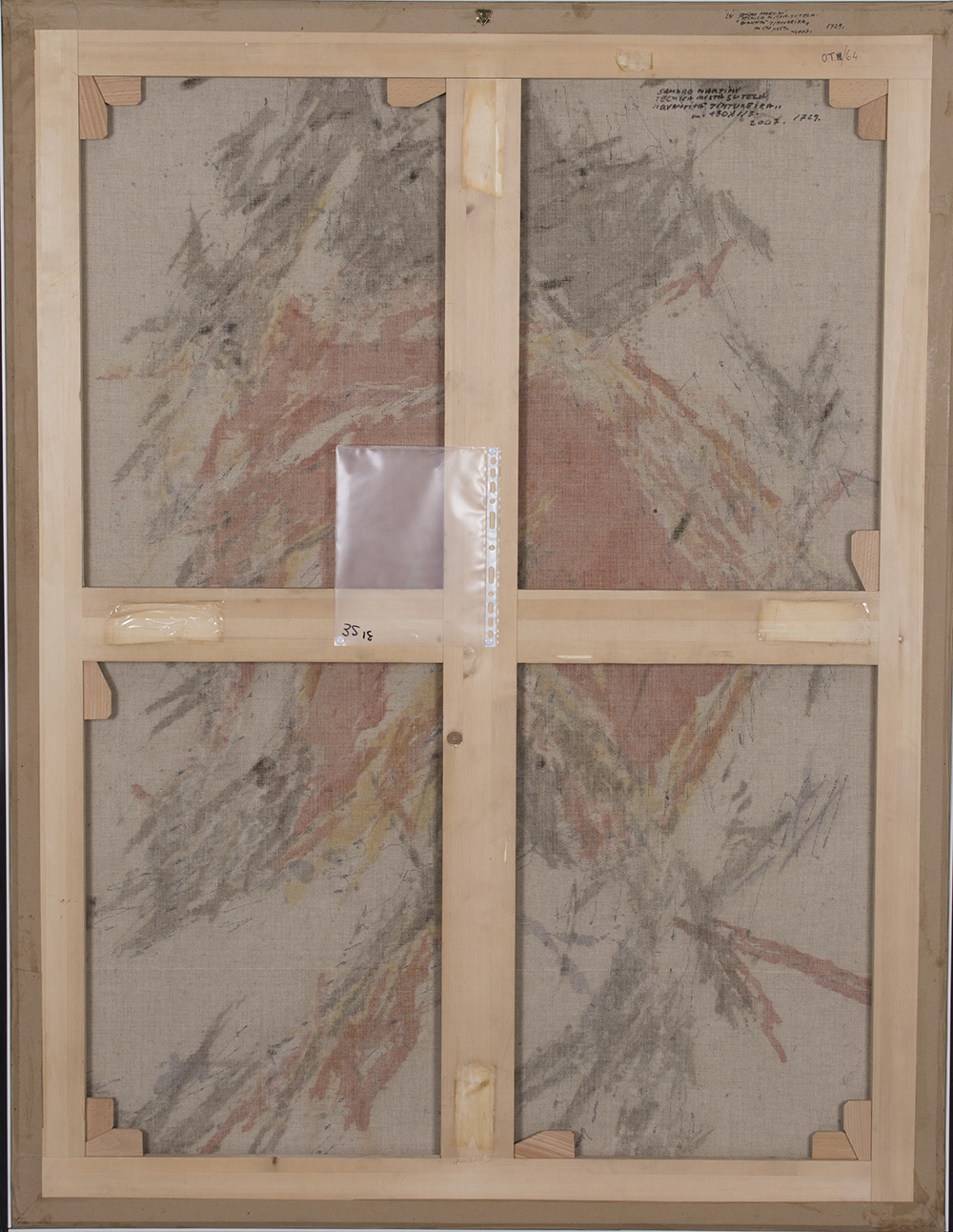 Firma, tecnica, misure, titolo e datazione al retro, sulla tela e sul telaio