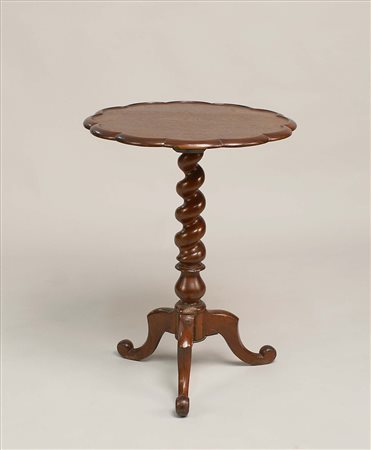 Gueridon in mogano, piano circolare con profilo smerlato poggiante su sostegno tornito con terminali a tripode, h. cm. 60.