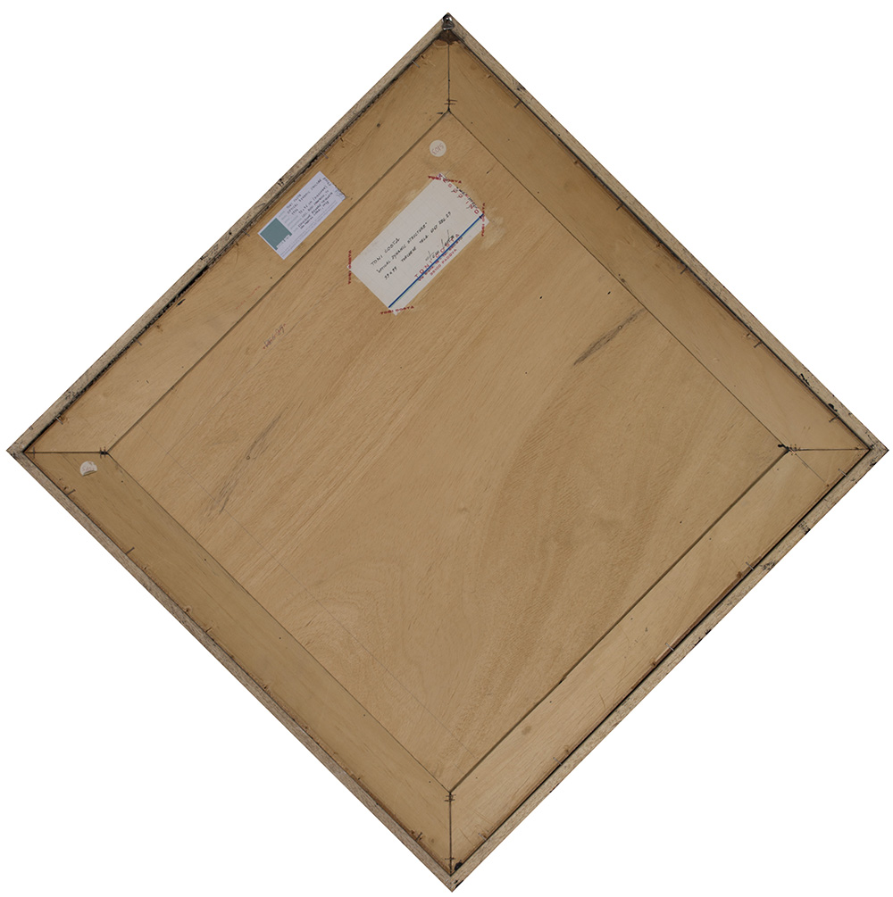cm 67 lato del quadrato dell'opera comprensiva di passepartout di fondo nero, parte dell'opera come indicato dallo stesso Artista sul cartiglio al retro
