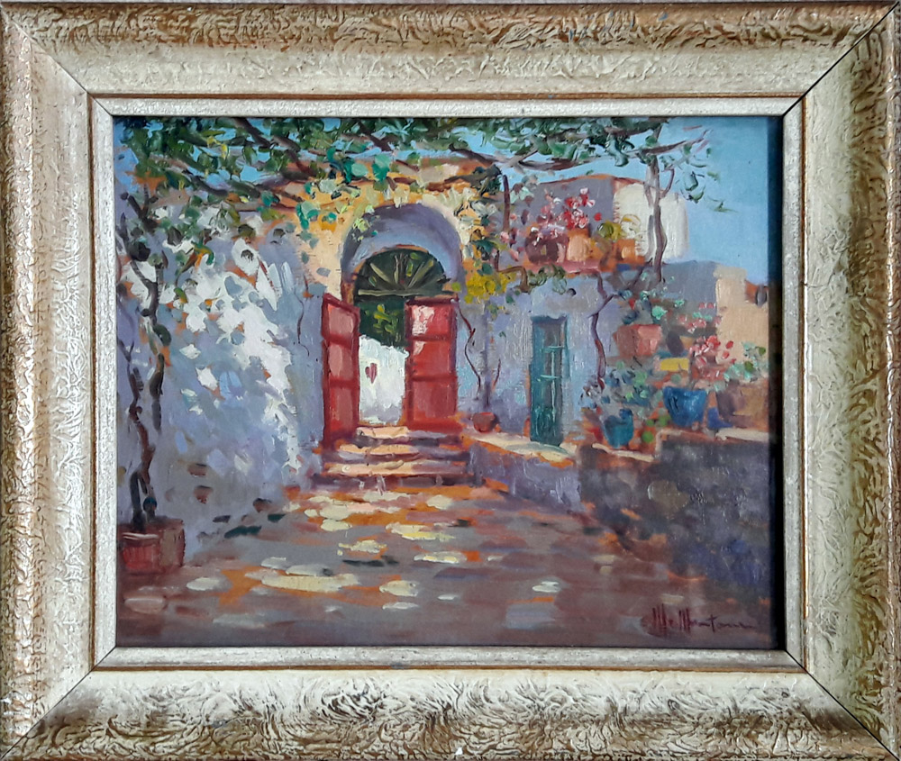 Michele Montanari "Veranda napoletana" - Olio su tavola - cm 24x30 - Firma dell'artista in basso a dx - Firma e titolo al retro
