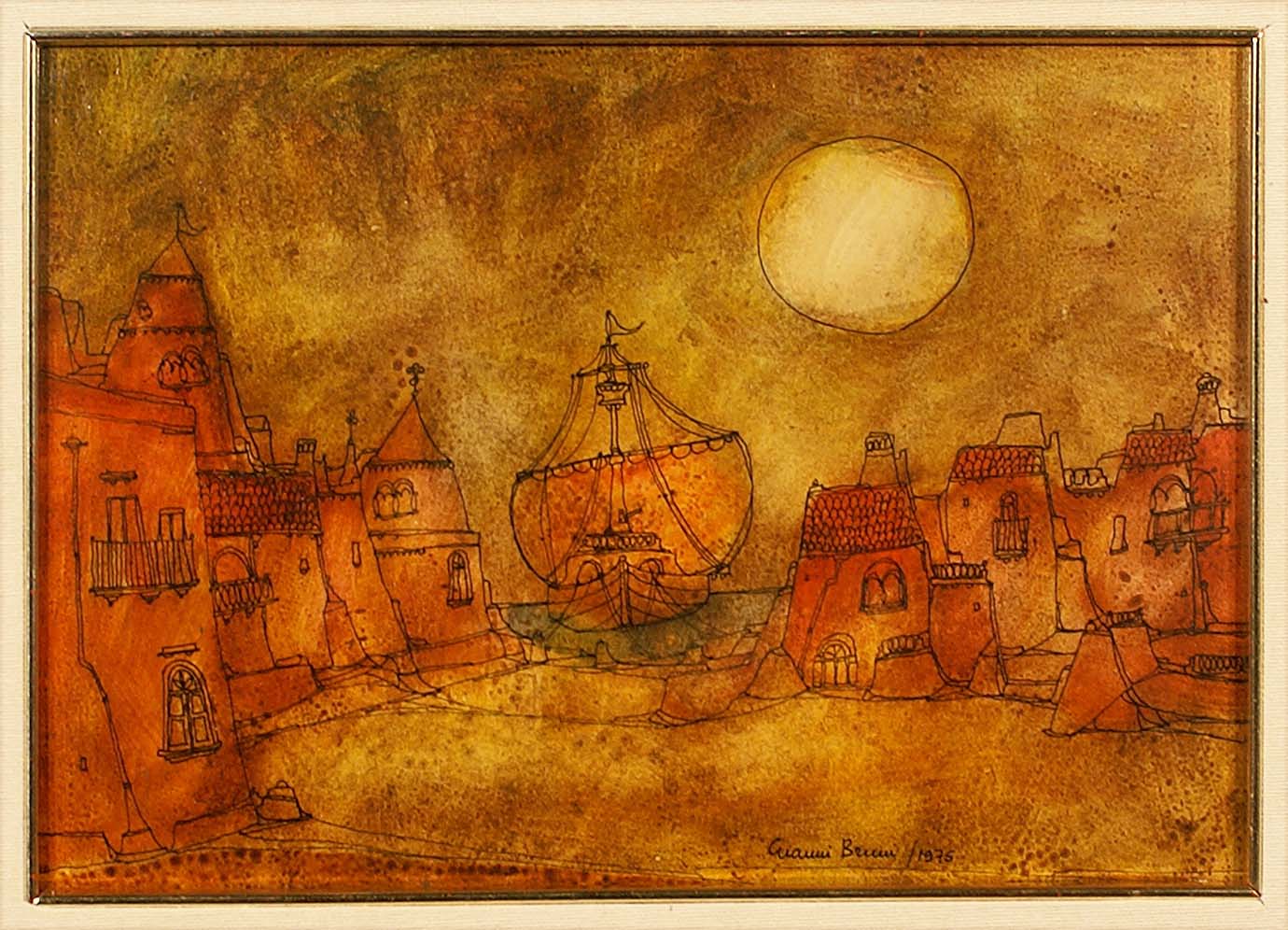 Gianni Bruni (Taranto 1935 - Roma 1995), "Sera d'Estate", chine colorate su faesite, cm. 25x35, anno 1975, firmato e datato in basso a destra.