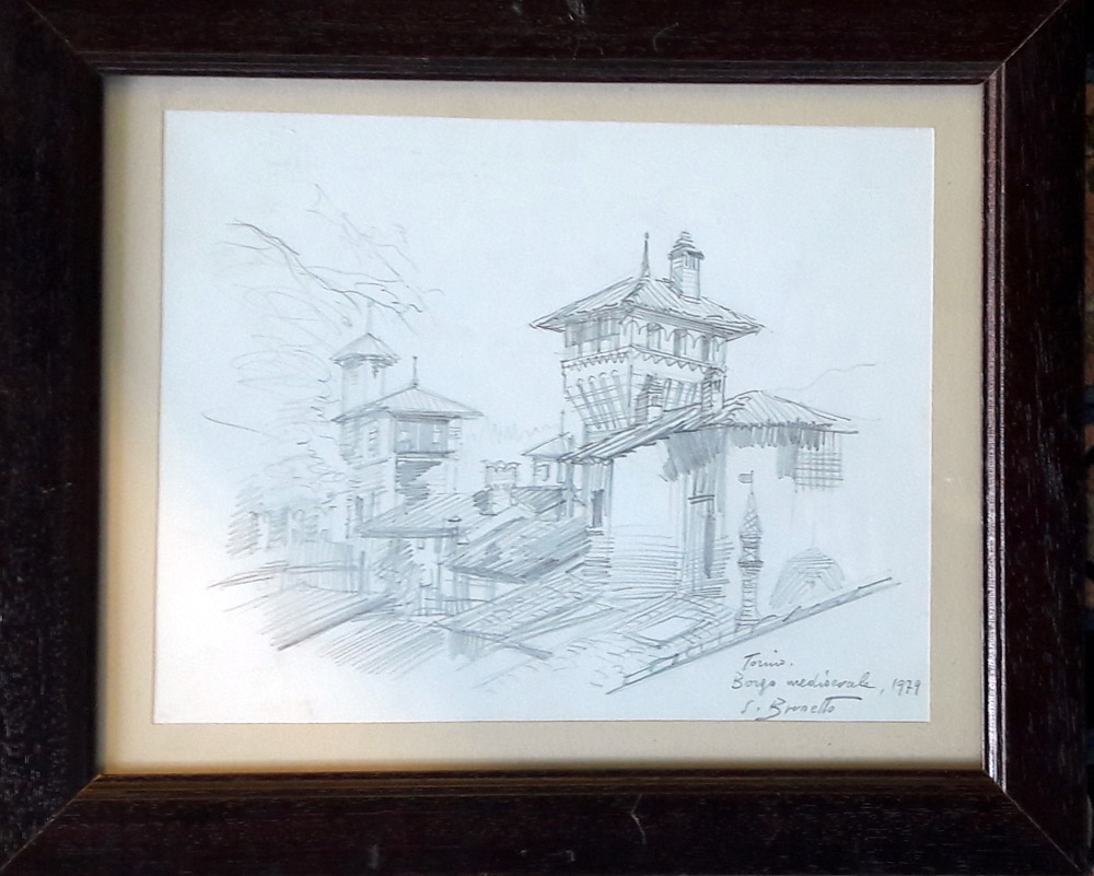Silvio Brunetto "Torino, Borgo Medievale" - 1979 - Matita su carta - cm 20x25 - Firma dell'artista, data e titolo in basso a dx