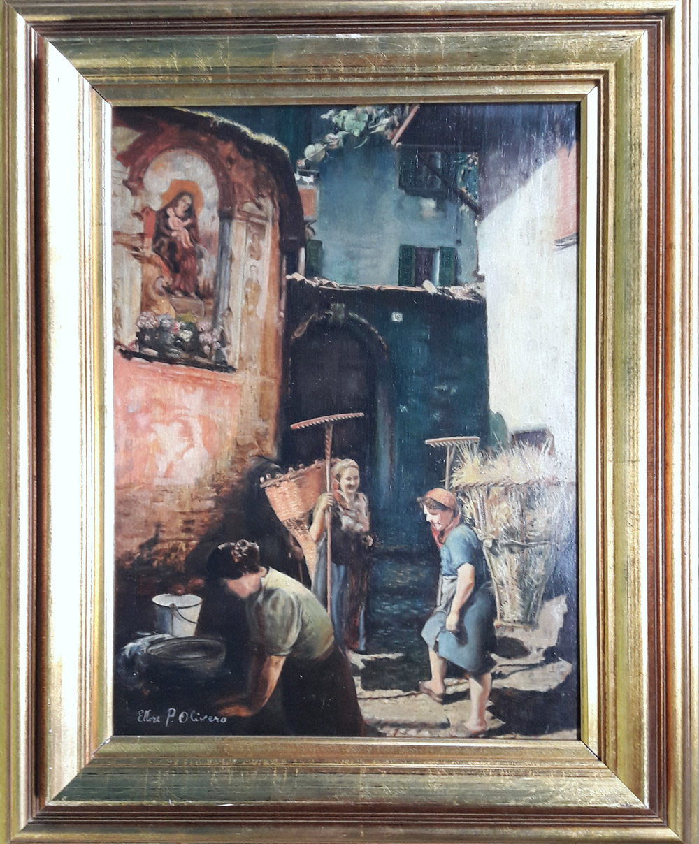 Ettore Pistoletto Olivero "Sosta: chiacchiere al lavatoio" - Olio su tavola - cm 48x35 - Firma dell'artista in basso a sx