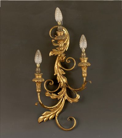 Applique a tre luci in metallo dorato e decorato a motivo vegetale, vecchia...