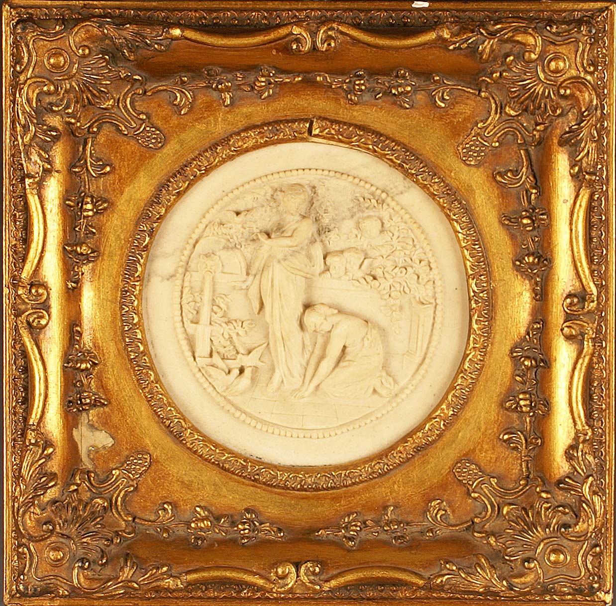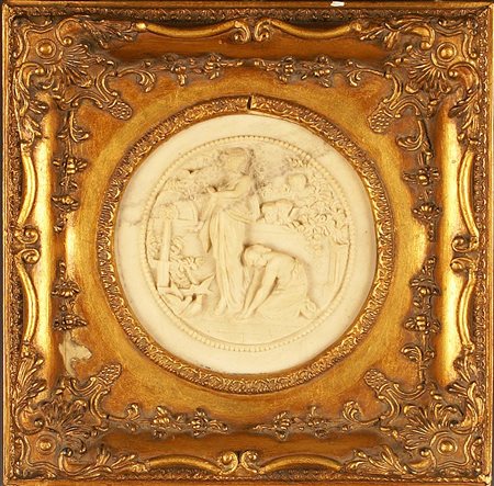 Altorilievo scolpito in pietra raffigurante ninfe e putti entro cornice in legno dorato, cm. 27,5x27,5.