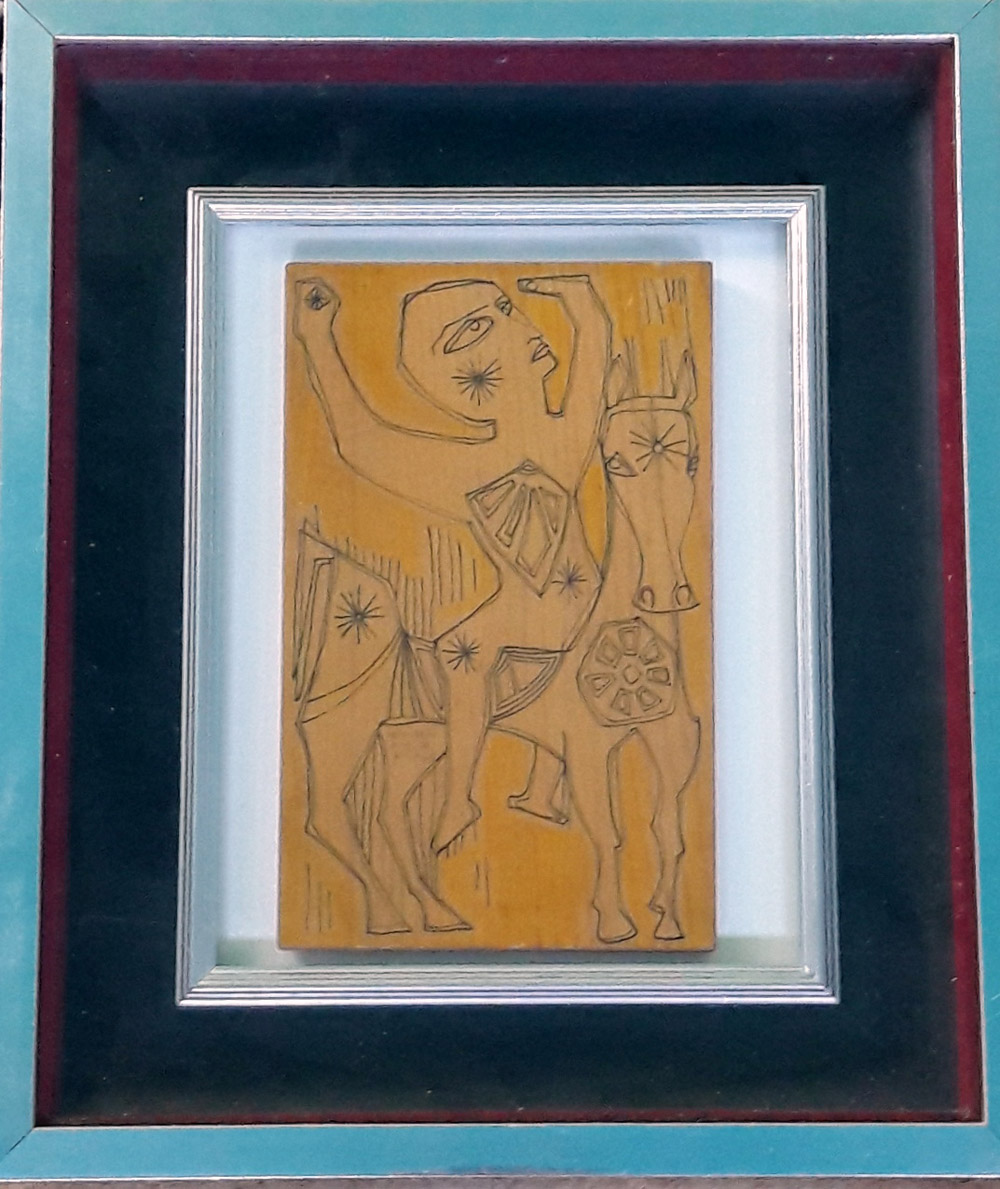 Mario Molinari "Cavaliere" - Pirografia su tavola - cm 29x18 - Firma dell'artista al retro - Dedica al retro al pittore Raffaele Pontecorvo