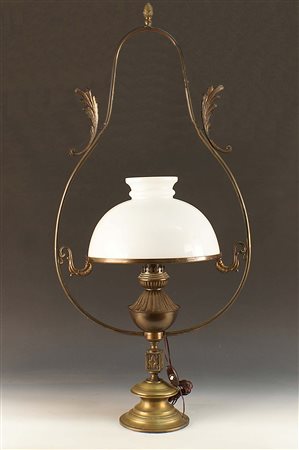 Lampada in ottone con coppa paralume in opalina bianca, vecchia manifattura, h. cm. 98.