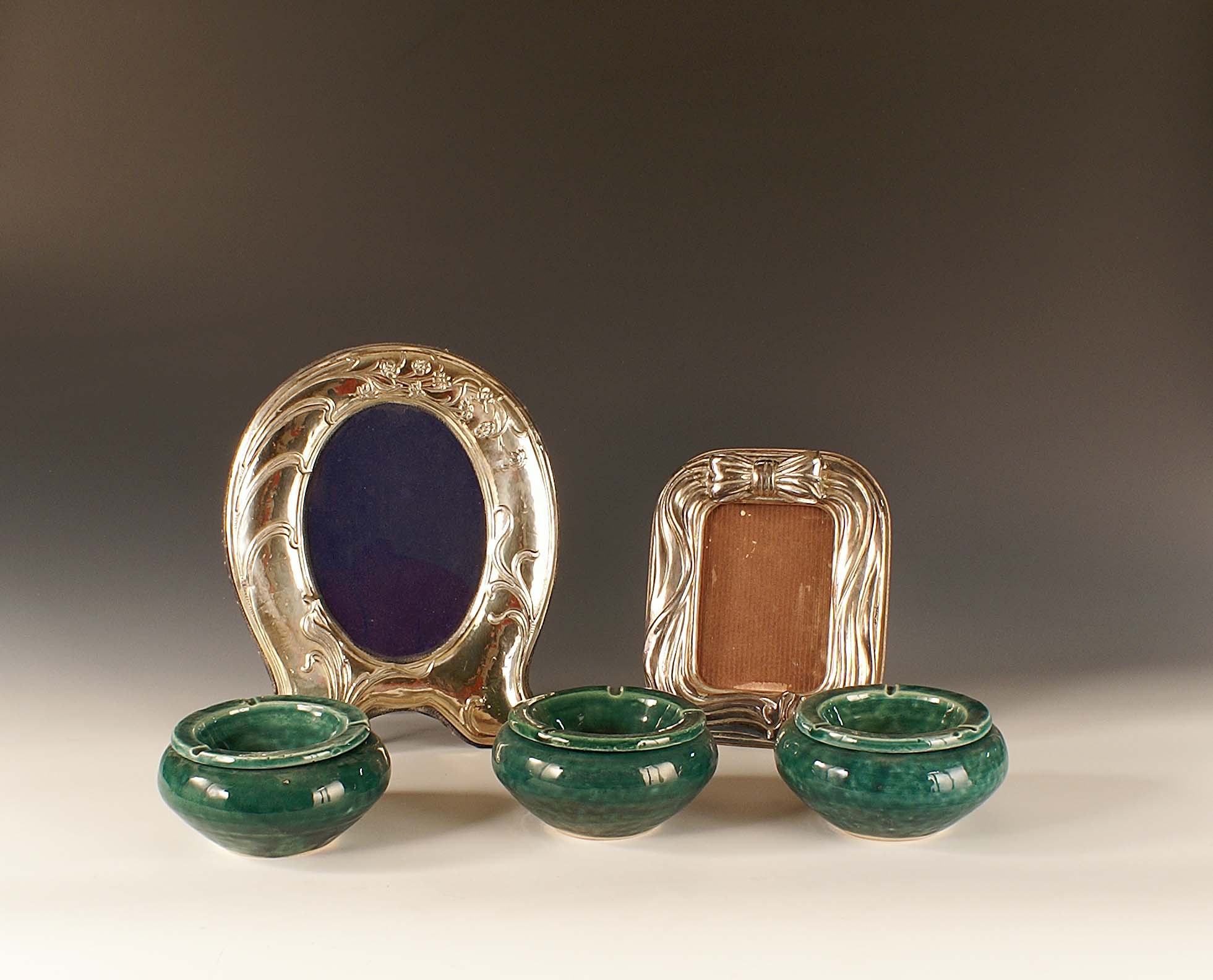 Lotto composto da due cornici in argento e tre posacenere in ceramica verde smaltata.