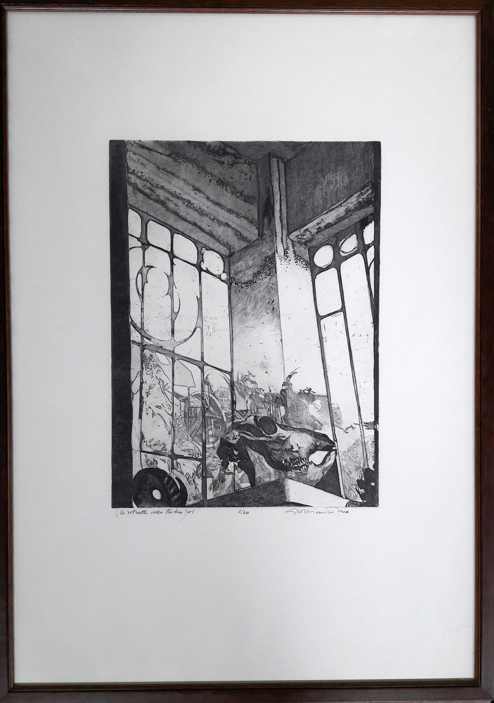 Giacomo Soffiantino "La vetrata dello studio" - Incisione su cartoncino - cm 74x51 - Firma in basso a dx - Es. n. 2/30