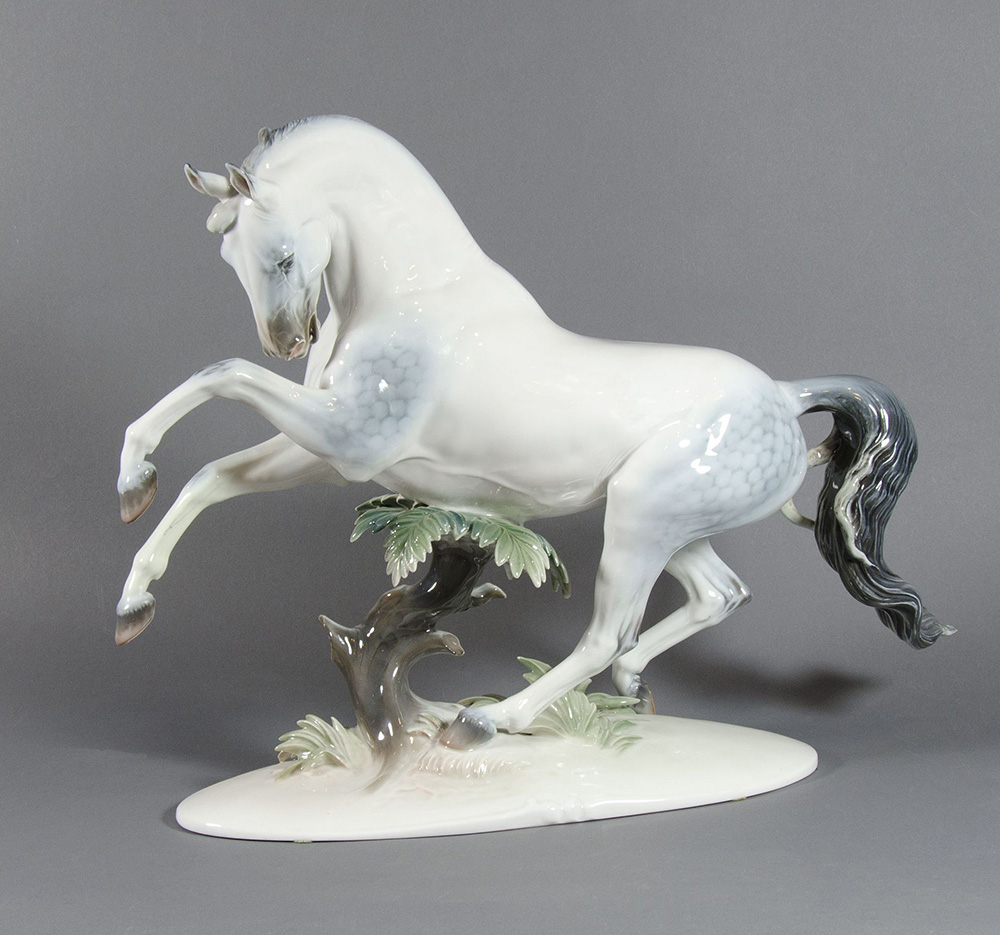 Rosenthal: grande scultura in porcellana policroma raffigurante cavallo. Marcata sotto la base. Lung. cm. 54. (restauro).