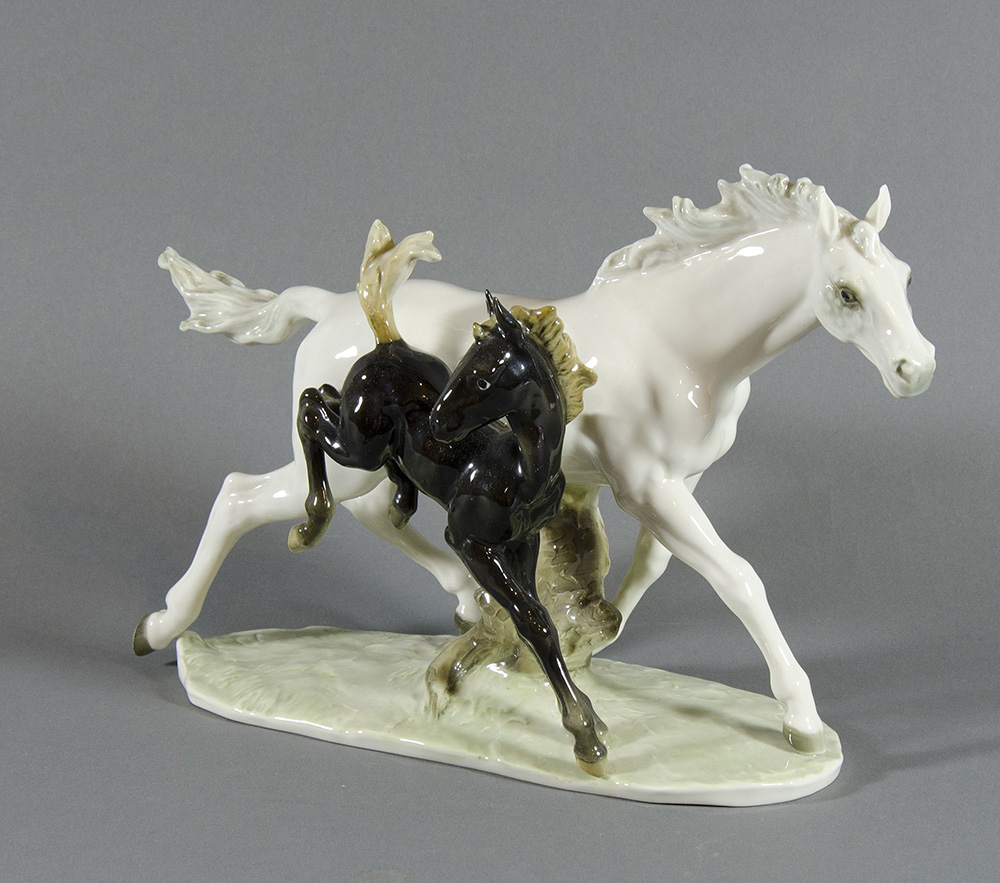 Hutschenreuter: scultura in porcellana policroma raffigurante due cavalli....