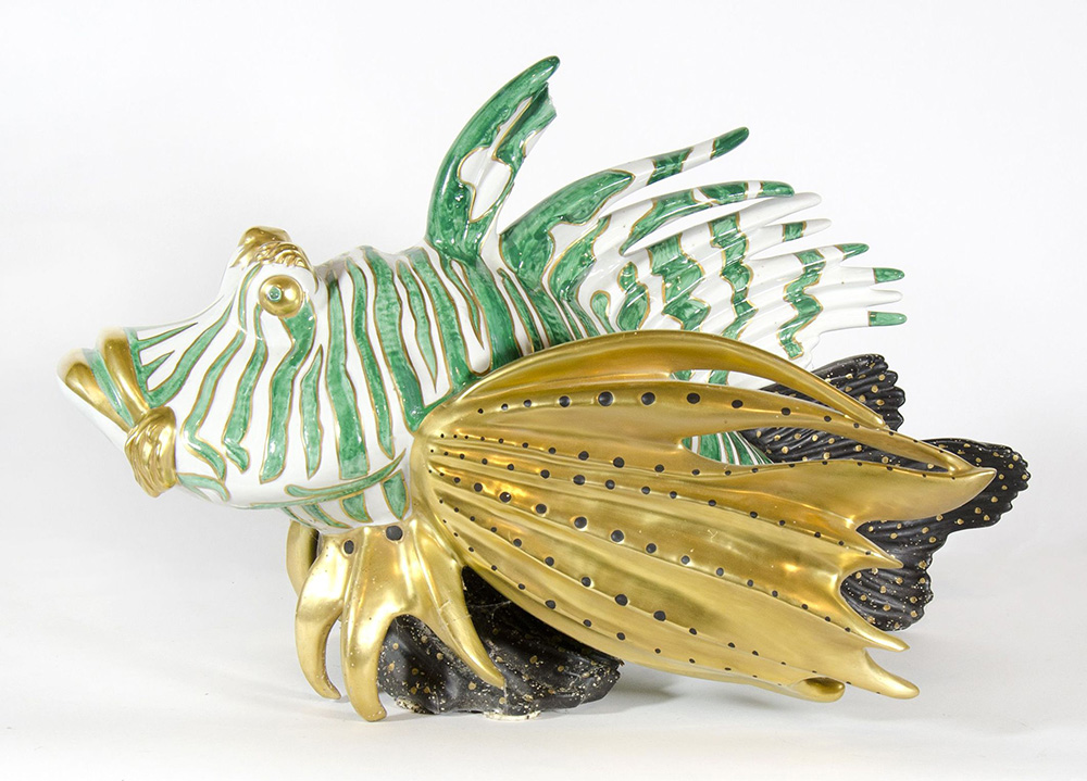 Manifattura Artistica Le Porcellane; grande scultura in porcellana policroma raffigurante pesce. Lung. cm. 58. (mancanze).