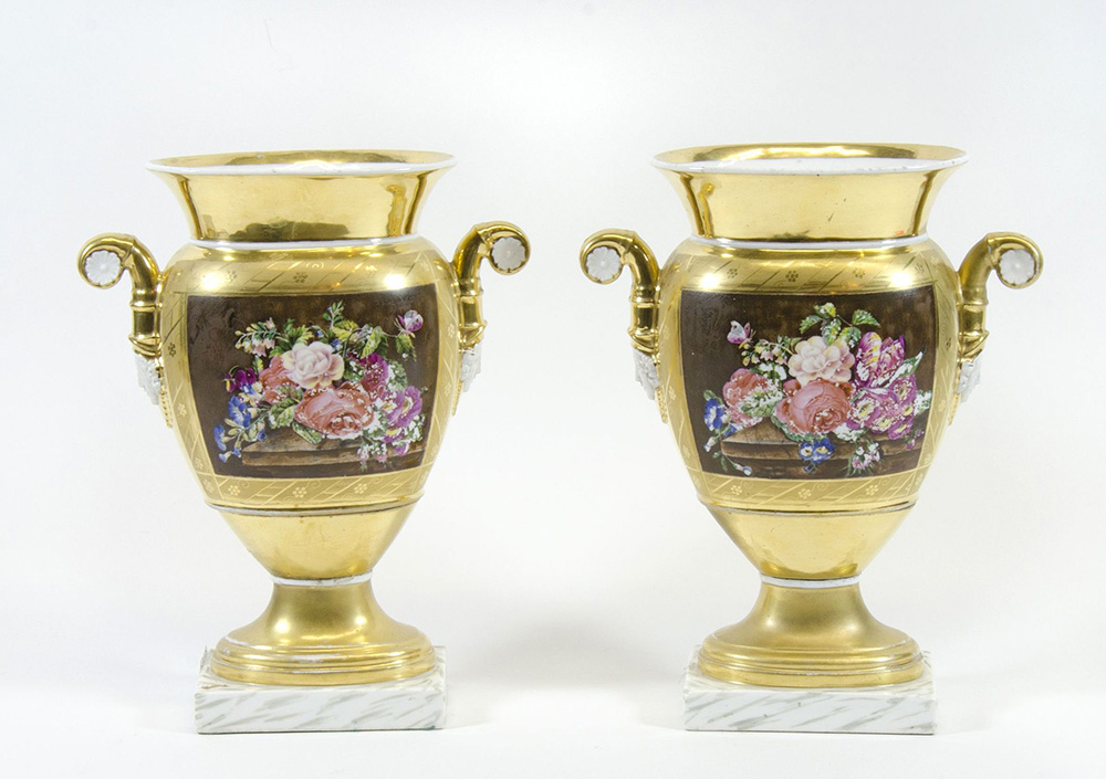 Coppia di vasi in porcellana dorata con medaglione centrale decorato a motivi floreali. Fine XIX secolo. H. cm. 25,5.
