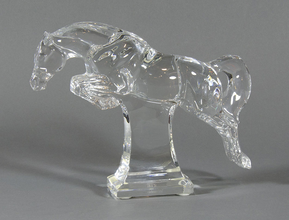 Baccarat: scultura in cristallo trasparente raffigurante cavallo. Firma incisa. Lung. cm. 26.