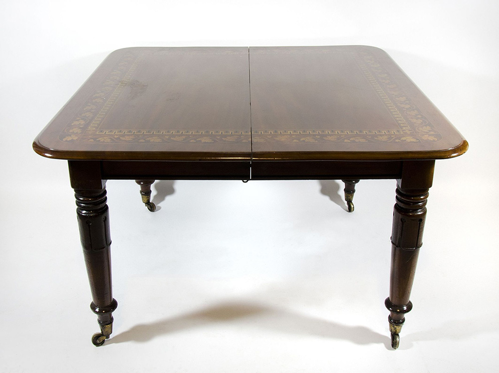 Tavolo da pranzo allungabile con piano intarsiato in legni chiari a motivi floreali e motivi geometrici, su 4 gambe scolpite. XIX secolo. cm. 72x122x160 (aperto).