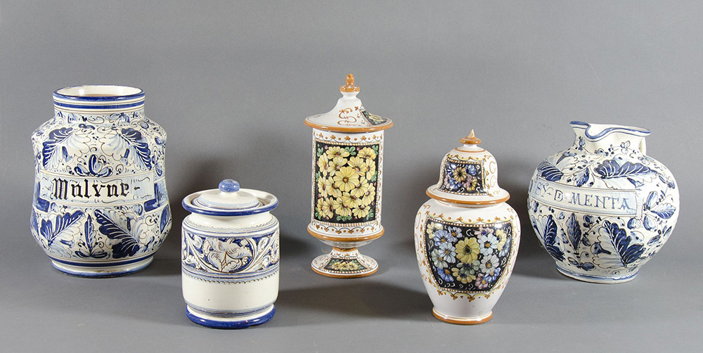 Lotto di 5 oggetti in ceramica policroma tra cui brocche.