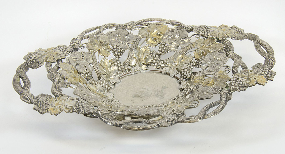 Centrotavola ovale in argento traforato con manici, decorato a motivi di...