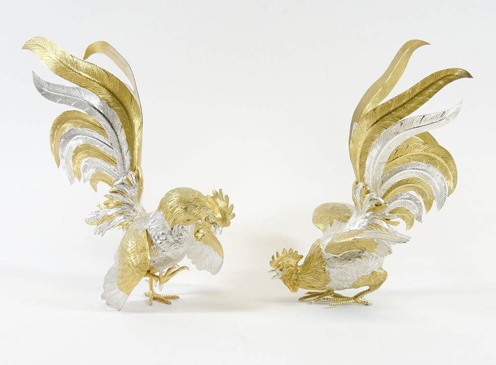 Lotto di 2 sculture in argento e argento dorato raffiguranti galli. XX secolo. H. max cm. 27. gr. 1500.