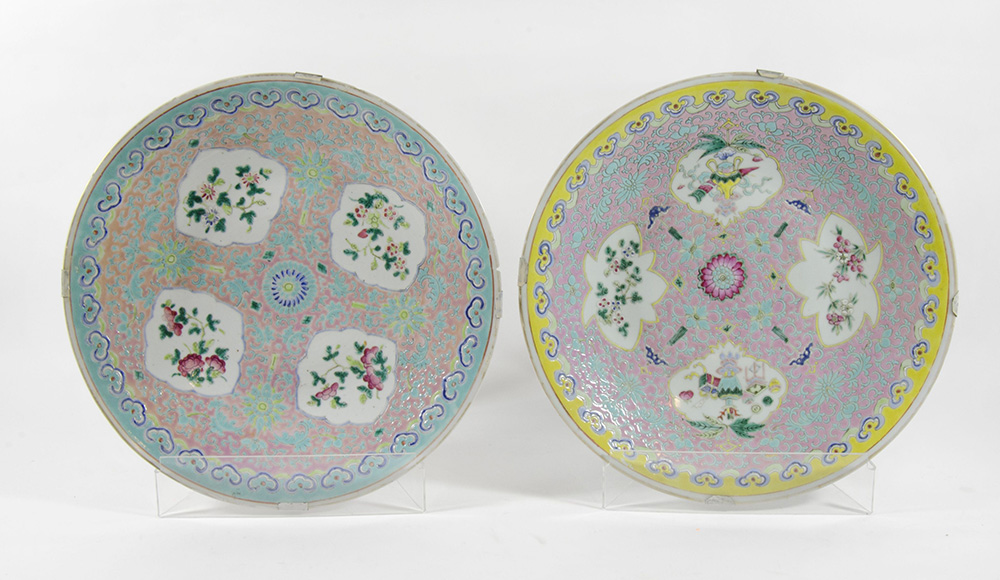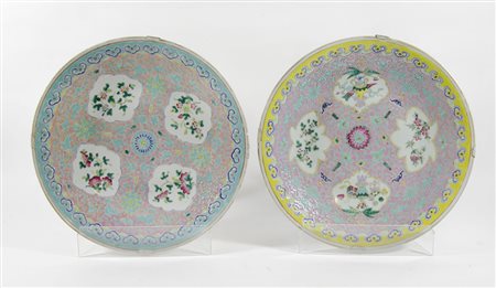 Lotto di 2 piatti in porcellana policroma decorati a motivi orientali. Diam. cm. 37.