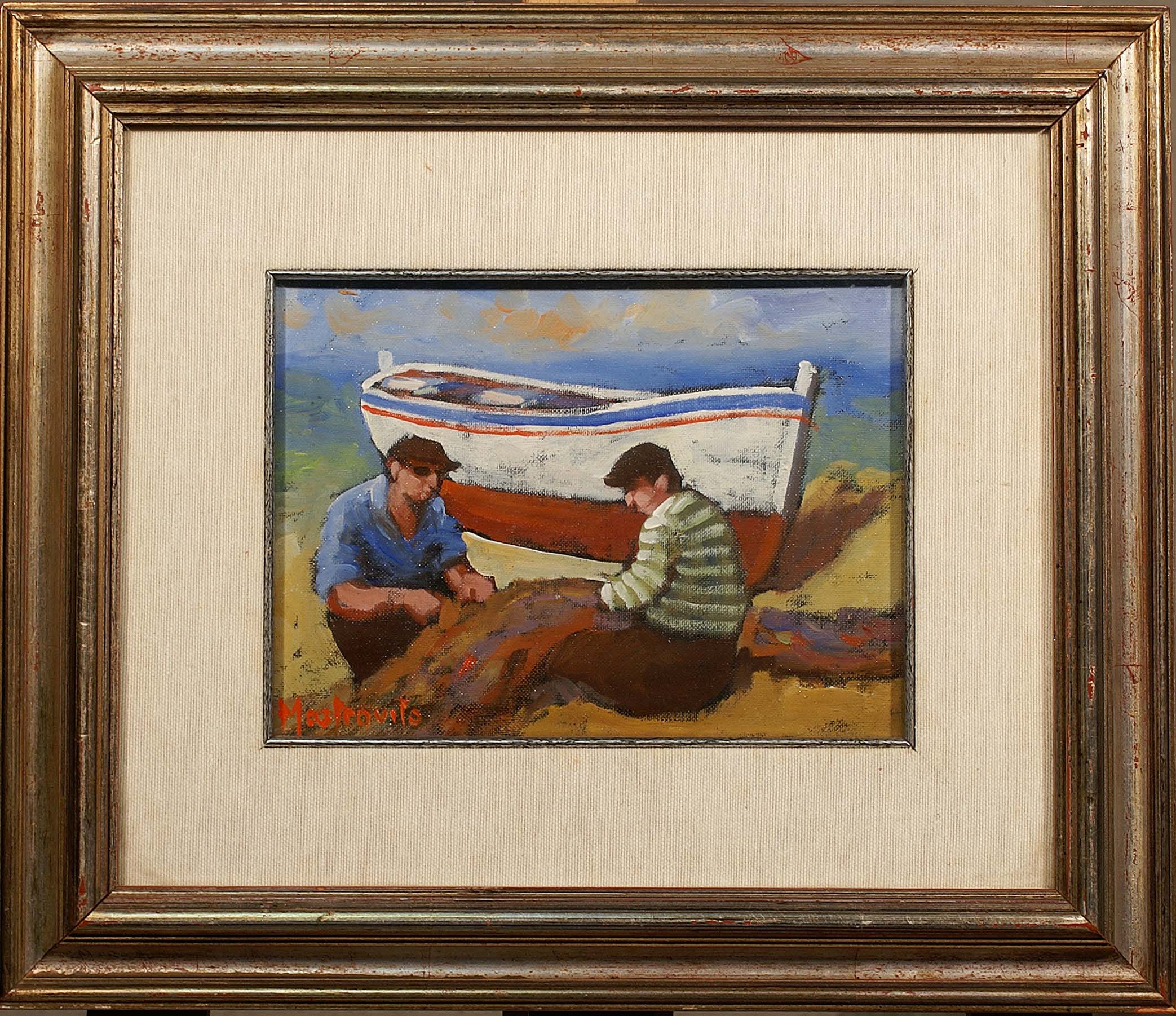 Ottavia Mastrovito (XX secolo), "Pescatori", olio su tela, cm. 18x24, firmato in basso a sinistra.