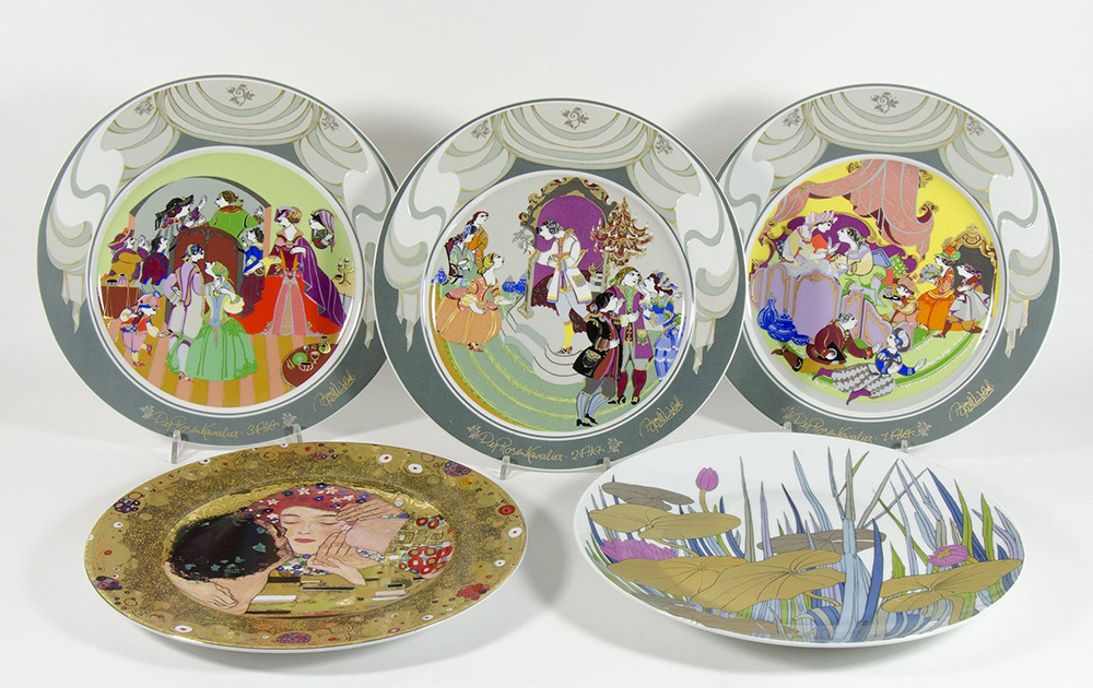 Lotto di 5 piatti in porcellana policroma tra cui 4 Rosenthal.