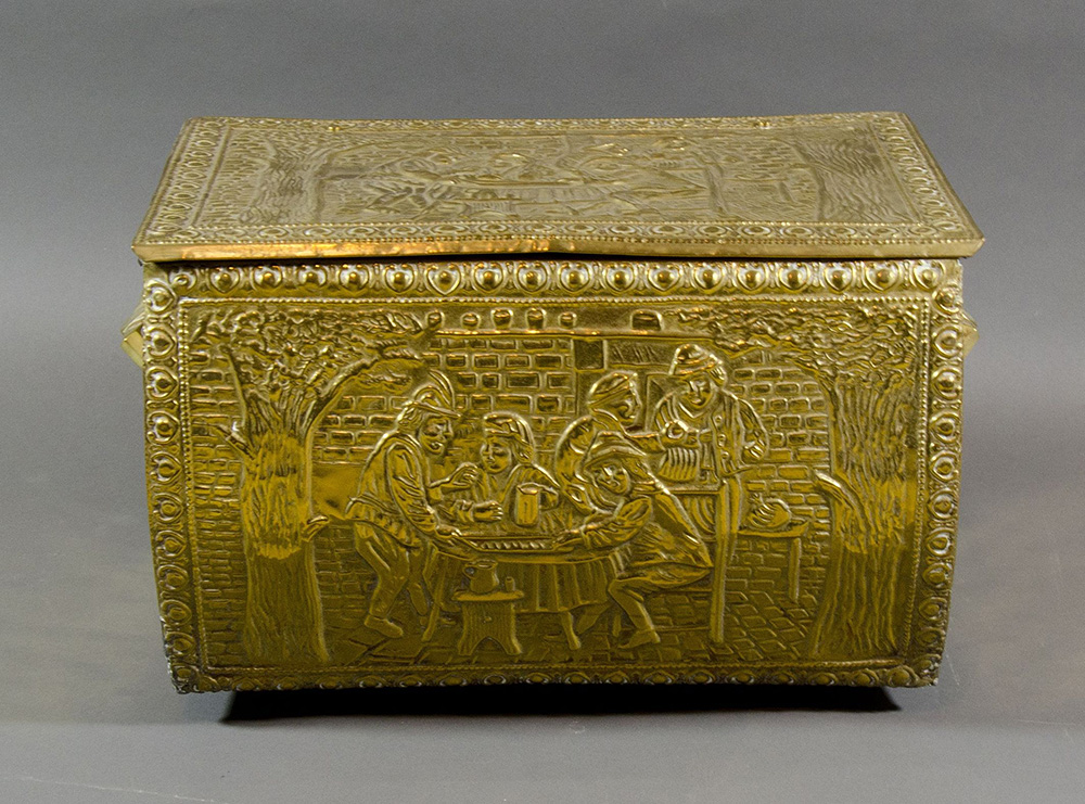Piccola cassa in metallo dorato con scena sbalzata sul coperchio. cm. 29x50x30.
