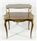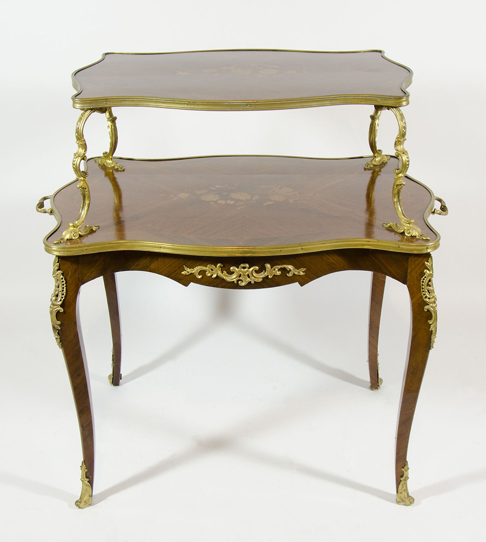 Tavolo da centro a 2 ripiani in legno con intarsi in legni chiari a motivi floreali e applicazioni in bronzo. cm. 90x88x56.