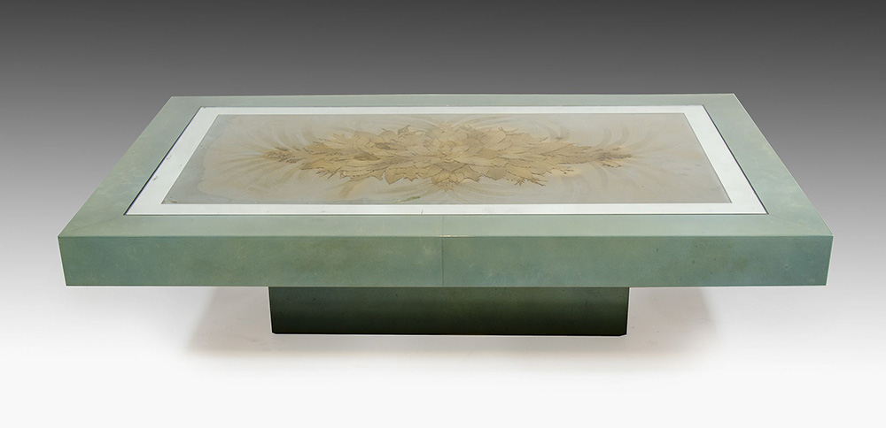 Tavolo basso laccato verde con piano decorato a foglie e specchio. cm. 36x150x90.