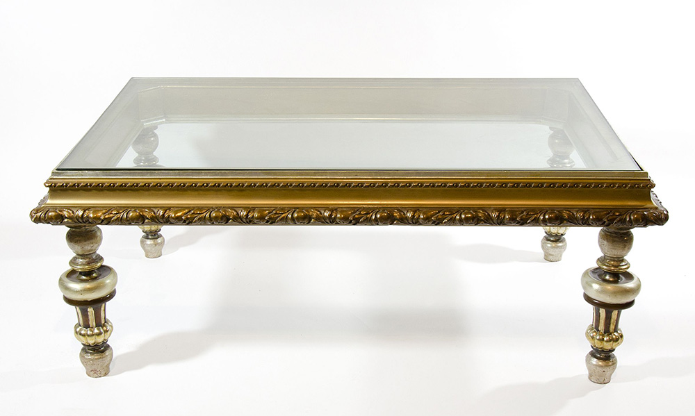 Grande tavolo basso da centro in legno dorato e legno argentato con piano in cristallo. cm. 53x140x92.