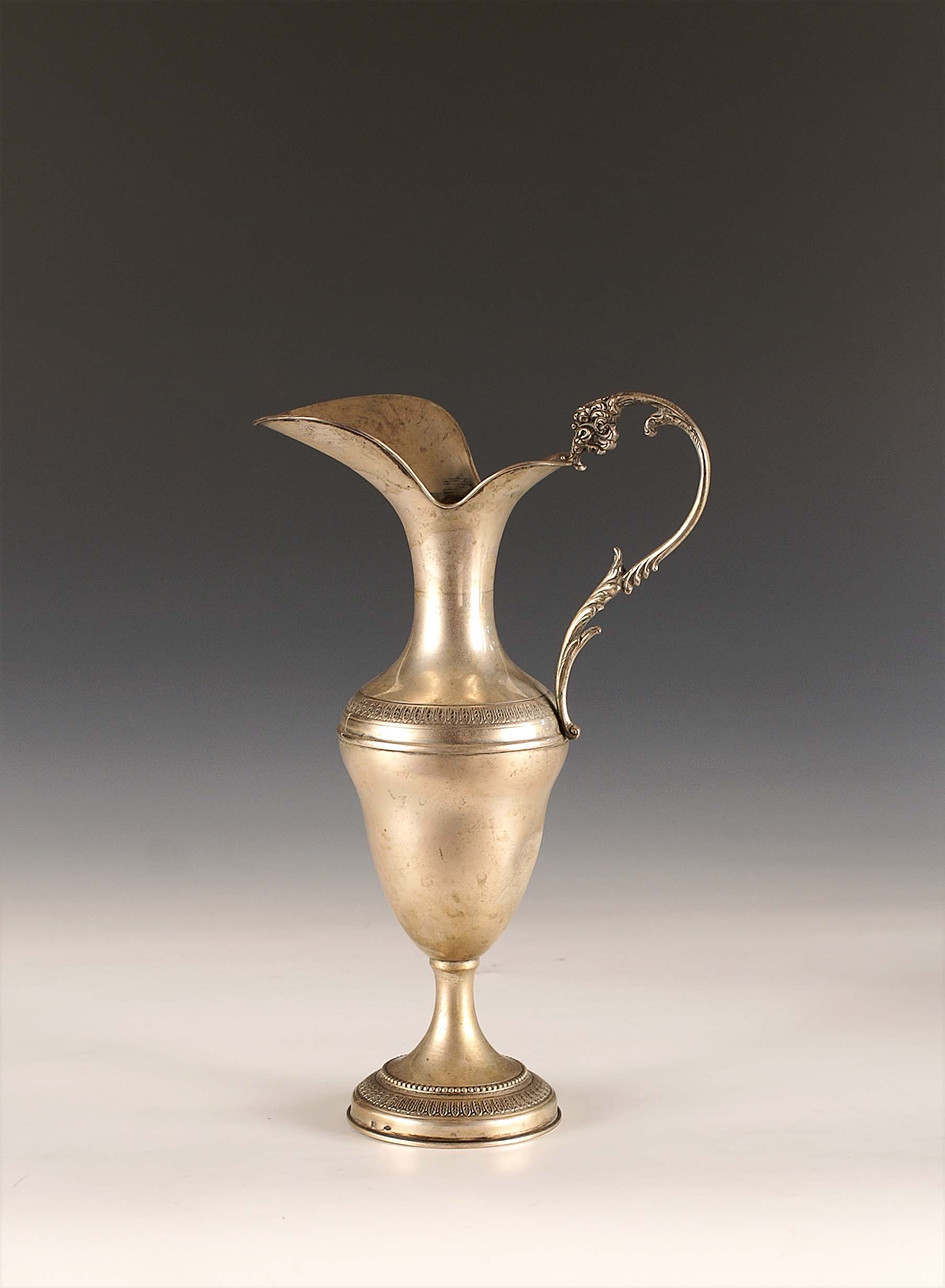 Versatoio in argento con ansa a voluta, gr. 250, h. cm. 26.