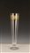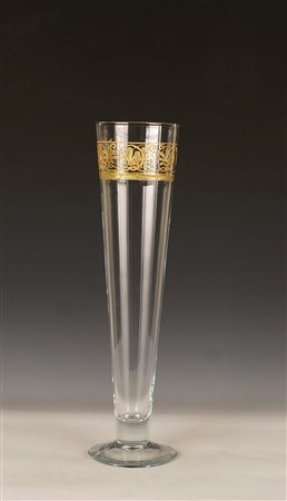 Vaso a tromba in vetro trasparente con decorazioni in oro, h. cm. 50.
