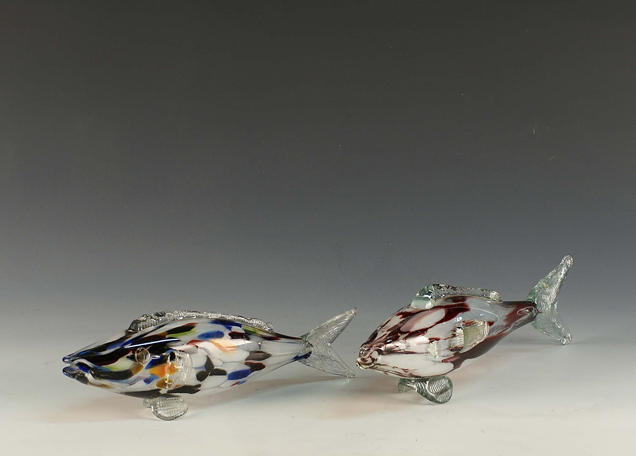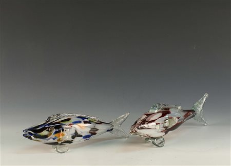Coppia di pesci in vetro soffiato policromo, Murano, vecchia manifattura, misure diverse.