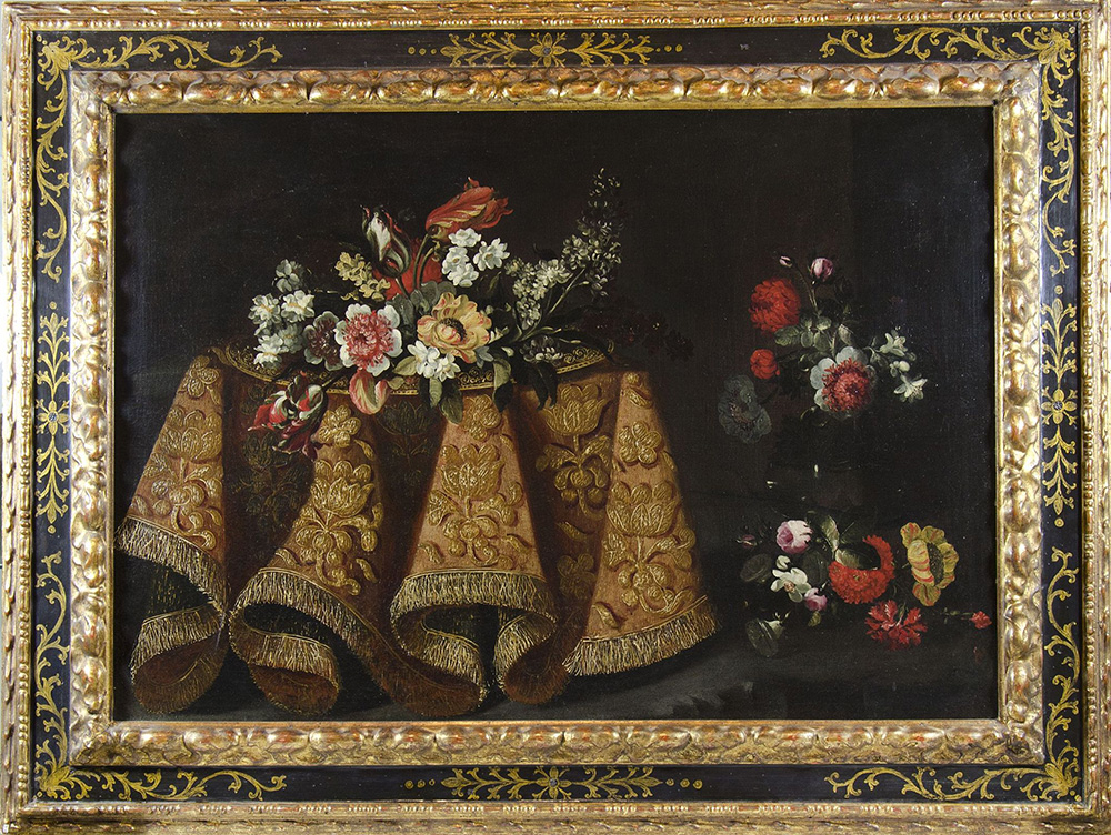 Maestro del XVIII secolo "Natura morta con drappo e fiori" cm. 68x98 - olio su tela foderata Sul dipinto è stata proposta l'attribuzione ad Antonio Gianlisi (1677-1727).