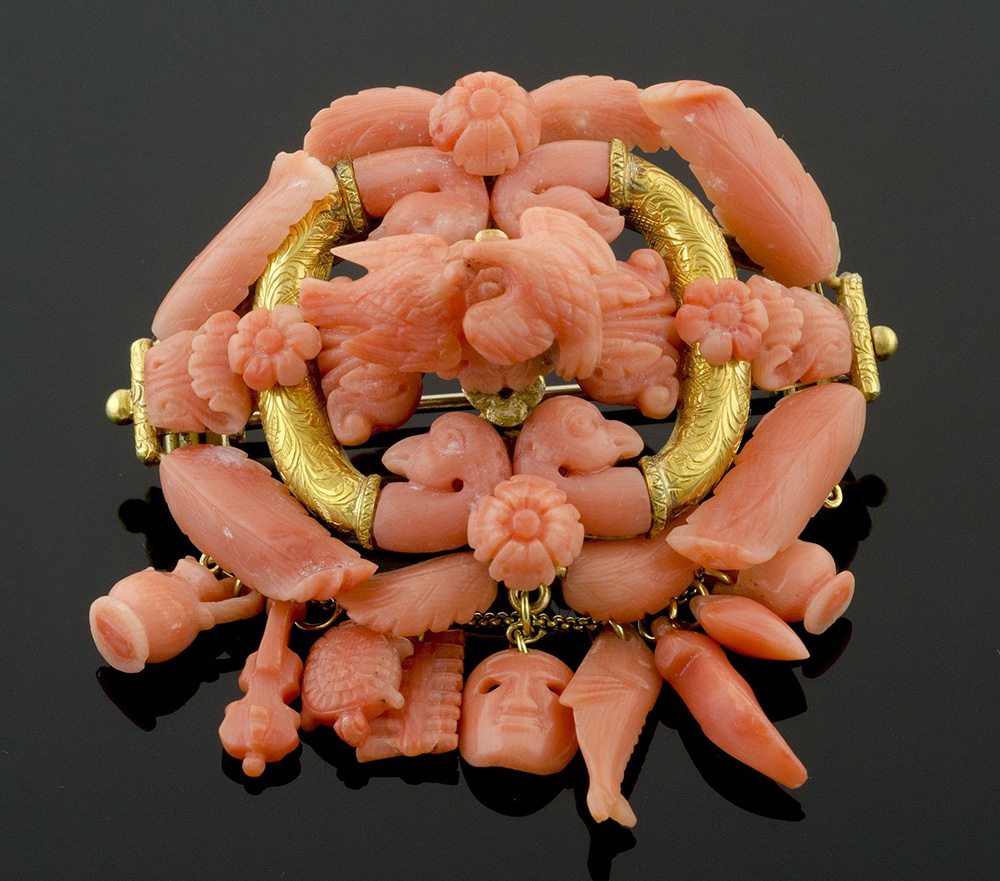 Grande spilla "napoletana" in corallo finemente inciso, montatura in oro. XIX secolo.