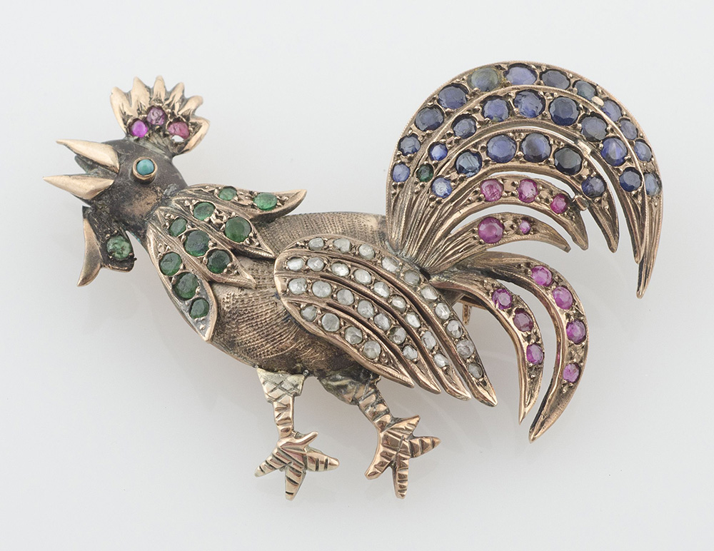 Spilla persiana in oro a forma di gallo ricoperta da diamanti, rubini, zaffiri e smeraldi.