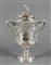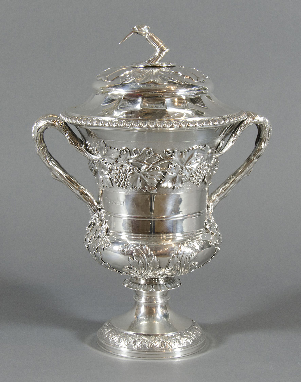 Grande coppa in argento riccamente lavorato a sbalzo a motivi di tralci d'uva, manici laterali a forma di tronchetti, al centro incisa una dedica al procuratore legale John Phillpotts di Gloucester datata 1825. interno dorato. Inghilterra, Londra 1805. H. cm. 31. gr. 1830.