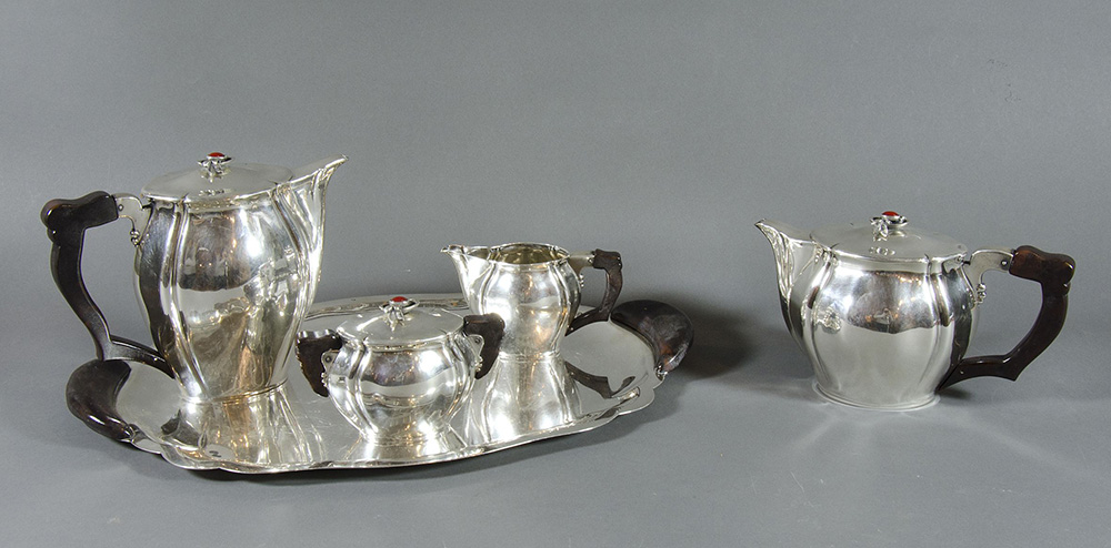 Servizio da caffè in argento con manici in legno composto da 5 pezzi, sui coperchi cabochon rosso. Periodo Art-Decò, punzoni Fascio Alessndria, A. Cesa S.C. gr. tot 2240.